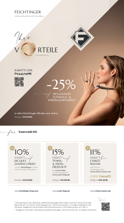 - Chrizz Rooms (ehemals Hotel Feichtinger): 11% Rabatt auf Nächtigungen mit Code "Coorp25" bei Onlinebuchung auf chrizz-rooms.com