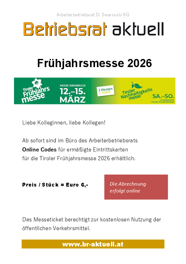 Die ermäßigten Tickets (€ 6,00 anstatt € 9,00) bekommt ihr mittels Online Code, der im Arbeiterbetriebsratsbüro erhältlich ist.