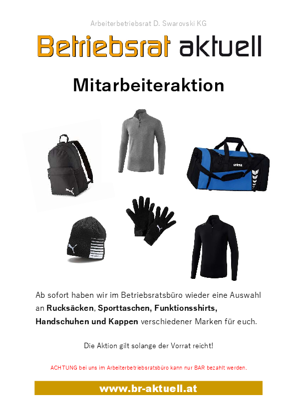 Ab sofort haben wir im BR-Büro wieder Rucksäcke, Sporttaschen, Funktionsshirts, Handschuhe und Kappen verschiedener Marken zu Spezialpeisen für euch.